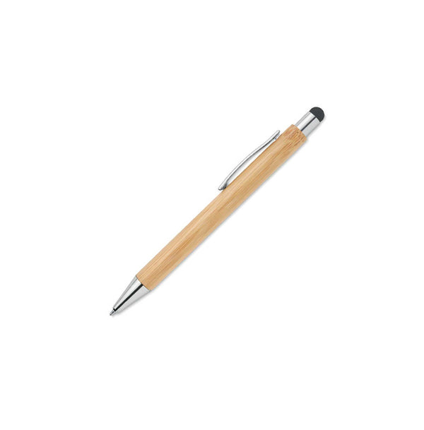 • Bamboo pens with a push-button eco-friendly finish, a stylus, and a button, tip, and clip with a chrome finish.